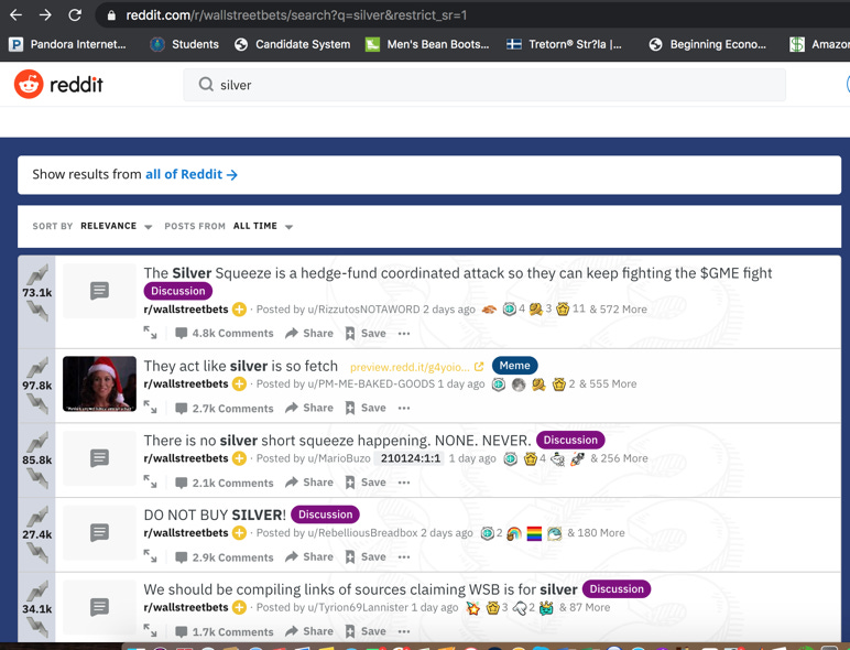 On Monday January 31, after a drop from $345 at close on Thursday to $197.44 at market close on Friday, major news networks such as CNBC, CNN, and the WSJ picked up that WallStreetBets on Reddit was targeting silver next. This story was almost entirely false, and can be confirmed by a simple search of WallStreetBets.
